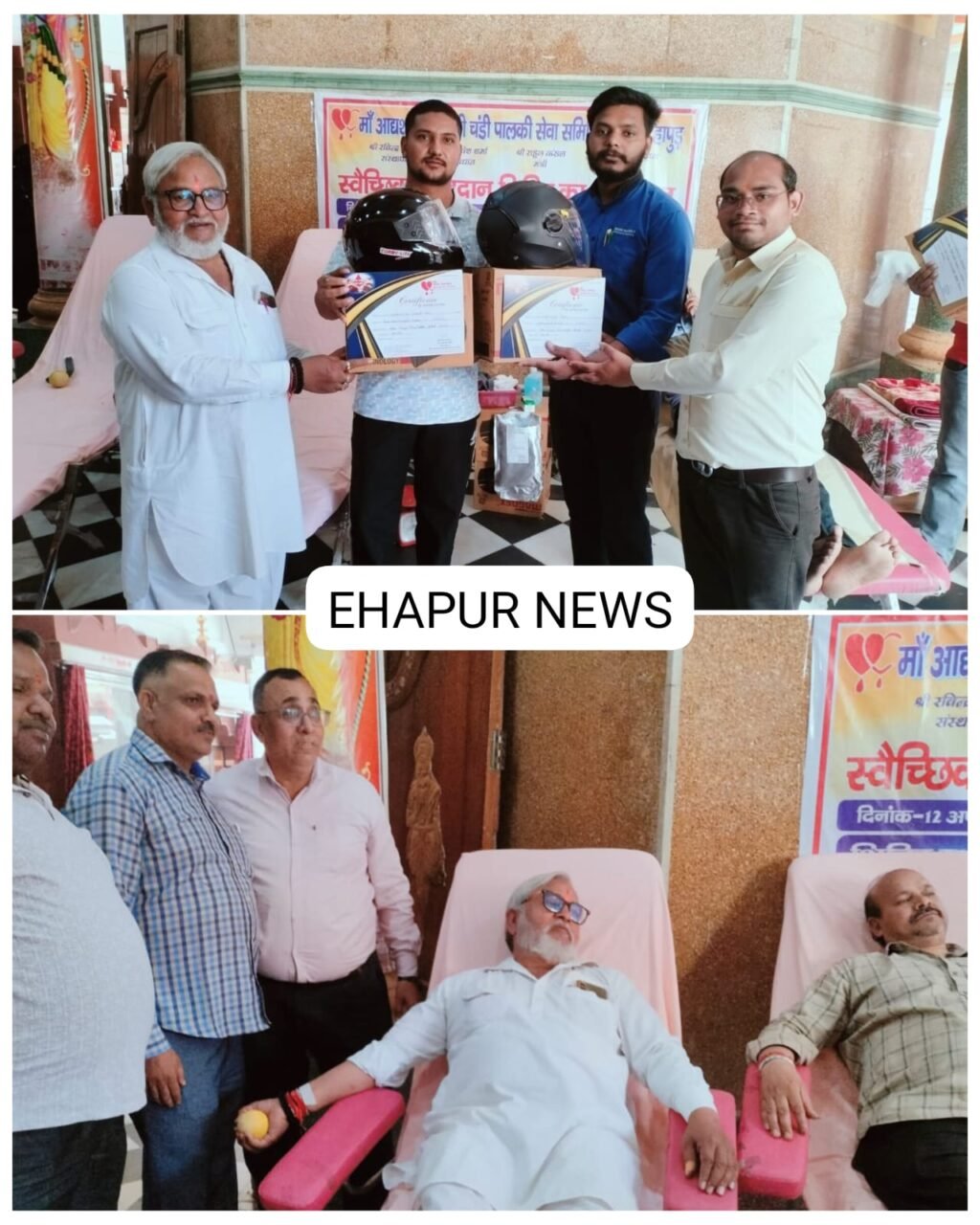 हापुड़, सीमन (ehapurnews.com): मां आद्यशक्ति श्री चंडी जी पालकी सेवा समिति पंजी० हापुड़ के तत्वावधान में श्री चंडी मंदिर प्रांगण में प्रथम रक्तदान शिविर एवं फ्री हेल्थ चैकअप का आयोजन किया गया जिसमें हापुड़ के 121 लोगों ने रक्तदान शिविर में उपस्थित होकर रक्तदान किया तथा शिविर में हापुड़ के श्री चंडी मंदिर प्रबंधक समिति (रजि०), हापुड़ के पदाधिकारियों ने और चंडी मंदिर के पुजारियों ने भी रक्तदान शिविर में बढ़-चढ़कर हिस्सा लेकर रक्तदान किया। इस मौके पर पालकी सेवा समिति पंजी० हापुड़ के पदाधिकारी एवं सेवादार उपस्थित रहे।