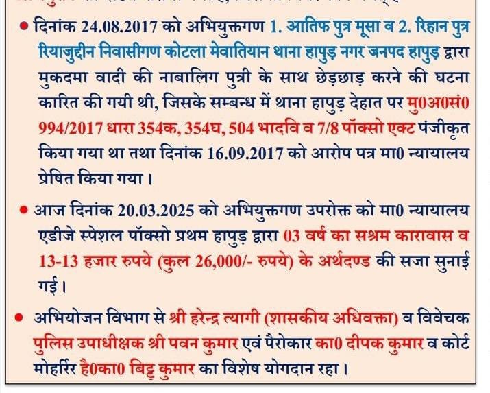 नाबालिग से छेडछाड पर तीन वर्ष का कारावास व अर्थदण्ड की सजा Featured Hapur City News || हापुड़ शहर न्यूज़ नाबालिग से छेडछाड पर तीन वर्ष का कारावास व अर्थदण्ड की सजा Satya Prakash Seeman March 21, 2025 नाबालिग से छेडछाड पर तीन वर्ष का कारावास व अर्थदण्ड की सजाहापुड, सीमन (ehapurnews.com):एडीजे स्पेशल पाक्सो प्रथम...Read More