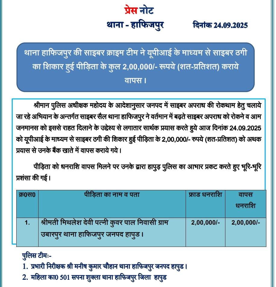 पुलिस ने साइबर ठगों से दो लाख वापिस दिलाए Featured Hapur City News || हापुड़ शहर न्यूज़ पुलिस ने साइबर ठगों से दो लाख वापिस दिलाए Satya Prakash Seeman September 25, 2025 पुलिस ने साइबर ठगों से दो लाख वापिस दिलाएहापुड, सीमन (ehapurnews.com):हापुड़ जनपद में साइबर अपराध की रोकथाम...Read More