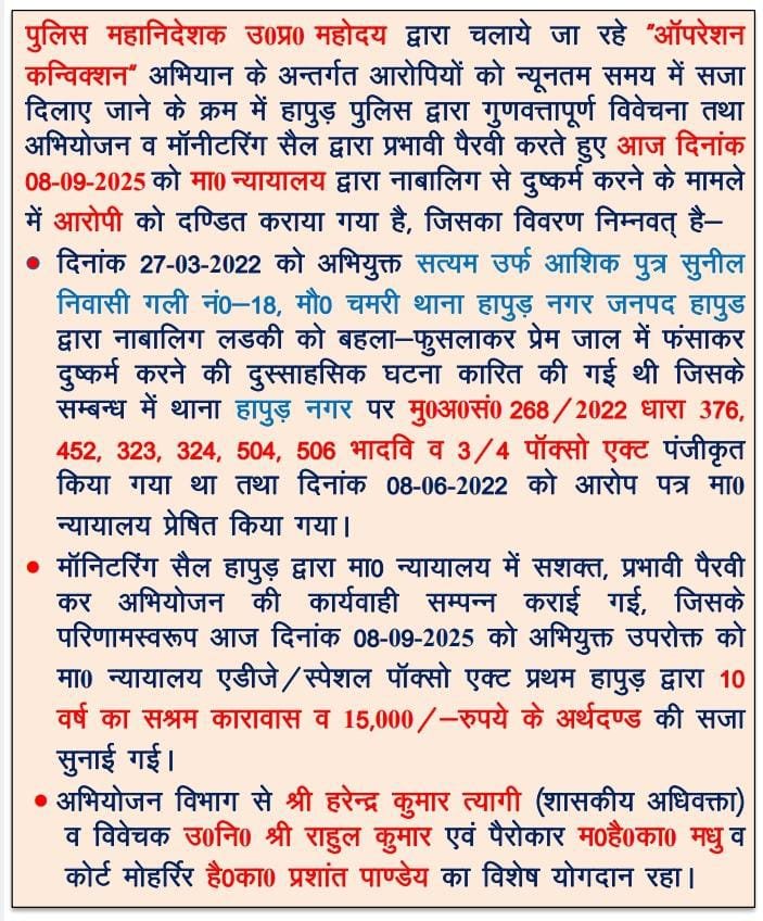 नाबालिग से दुष्कर्म पर 10 वर्ष का कारावास Featured Hapur City News || हापुड़ शहर न्यूज़ नाबालिग से दुष्कर्म पर 10 वर्ष का कारावास Satya Prakash Seeman September 8, 2025 नाबालिग से दुष्कर्म पर 10 वर्ष का कारावासहापुड, सीमन (ehapurnews.com):एक नाबालिग को अपने प्रैमजाल में फंसा कर...Read More