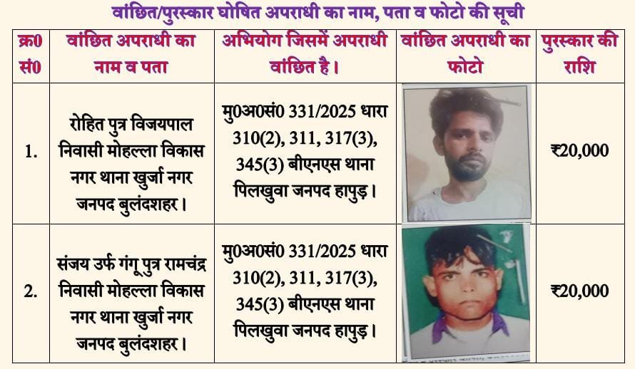 खुर्जा के दो बदमाशों पर 20-20 हजार का इनाम घोषित Featured Hapur City News || हापुड़ शहर न्यूज़ खुर्जा के दो बदमाशों पर 20-20 हजार का इनाम घोषित Satya Prakash Seeman December 18, 2025 खुर्जा के दो बदमाशों पर 20-20 हजार का इनाम घोषितहापुड सीमन (ehapurnews.com):हापुड़ पुलिस द्वारा जनपद में अपराधों...Read More