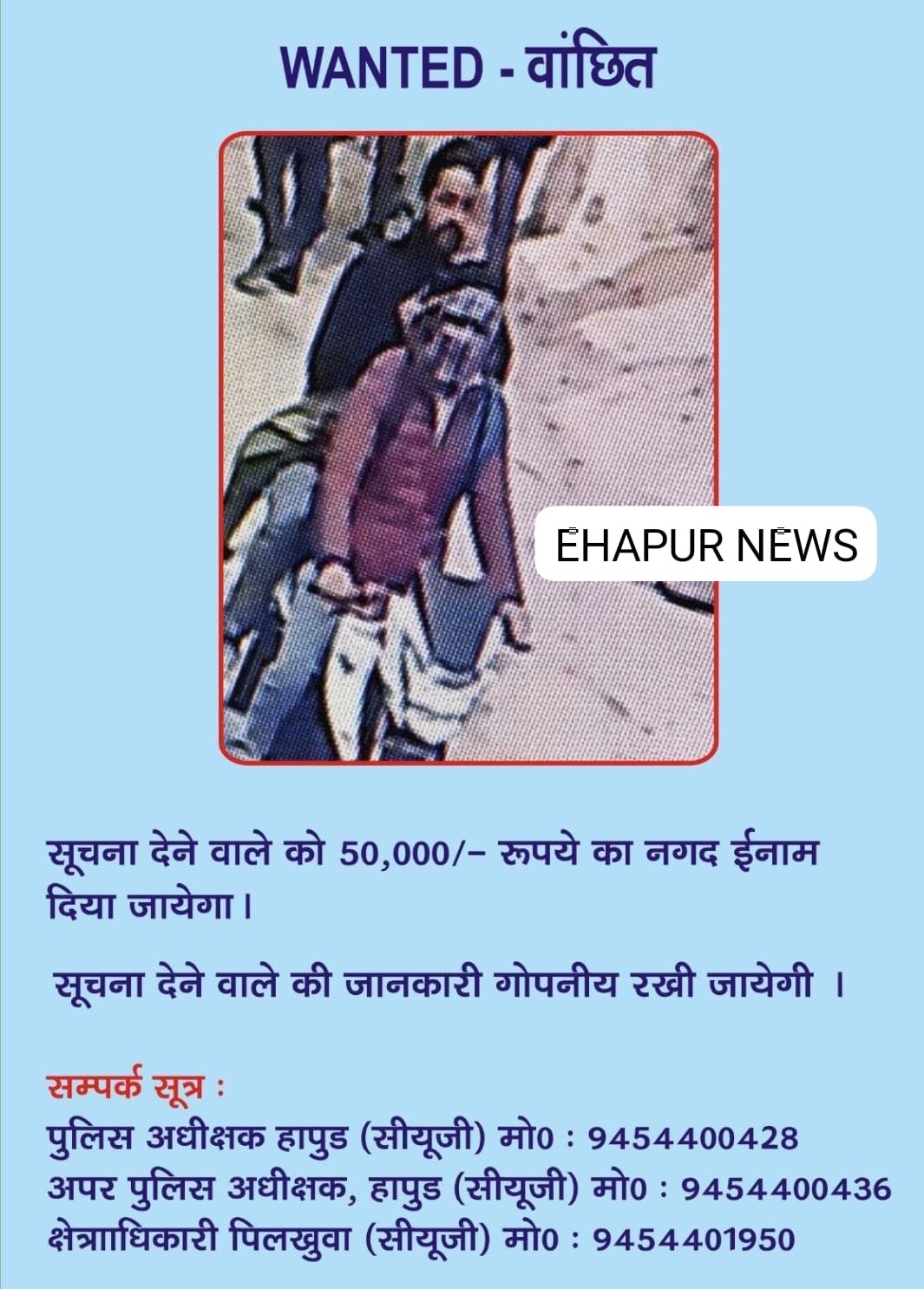 पिलखुवा: हाईवे पर 85 लाख की लूट करने वाले संदिग्ध बदमाशों के पोस्टर जारी, 50 हजार का इनाम घोषित Featured पिलखुवा: हाईवे पर 85 लाख की लूट करने वाले संदिग्ध बदमाशों के पोस्टर जारी, 50 हजार का इनाम घोषित Pankaj Kashyap December 16, 2025 हापुड़, सीमन / संजय कश्यप (ehapurnews.com): जनपद हापुड़ के पिलखुवा कोतवाली क्षेत्र के हाईवे पर सोमवार को...Read More