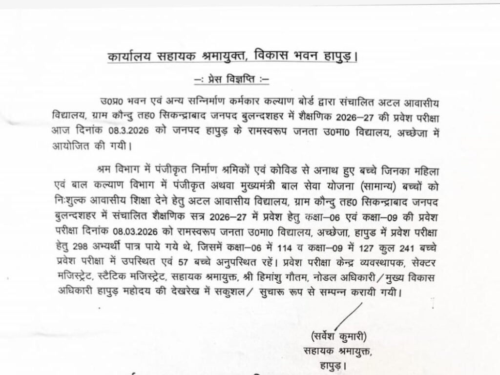 श्रम विभाग में पंजीकृत निर्माण श्रमिकों एवं कोविड से अनाथ हुए बच्चे जिनका महिला एवं बाल कल्याण विभाग में पंजीकृत अथवा मुख्यमंत्री बाल सेवा योजना (सामान्य) बच्चों को निःशुल्क आवासीय शिक्षा देने हेतु अटल आवासीय विद्यालय, ग्राम कौन्दु तह० सिकन्द्राबाद जनपद बुलन्दशहर में संचालित शैक्षणिक सत्र 2026-27 में प्रवेश हेतु कक्षा-06 एवं कक्षा-09 की प्रवेश परीक्षा दिनांक 08.03.2026 को रामस्वरूप जनता उ०मा० विद्यालय, अच्छेजा, हापुड में प्रवेश परीक्षा हेतु 298 अभ्यर्थी पात्र पाये गये थे, जिसमें कक्षा-06 में 114 व कक्षा-09 में 127 कुल 241 बच्चे प्रवेश परीक्षा में उपस्थित एवं 57 बच्चे अनुपस्थित रहें। प्रवेश परीक्षा केन्द्र व्यवस्थापक, सेक्टर मजिस्ट्रेट, स्टैटिक मजिस्ट्रेट, सहायक श्रमायुक्त, श्री हिमांशु गौतम, नोडल अधिकारी / मुख्य विकास अधिकारी हापुड़ महोदय की देखरेख में सकुशल / सुचारू रूप से सम्पन्न करायी गयी।