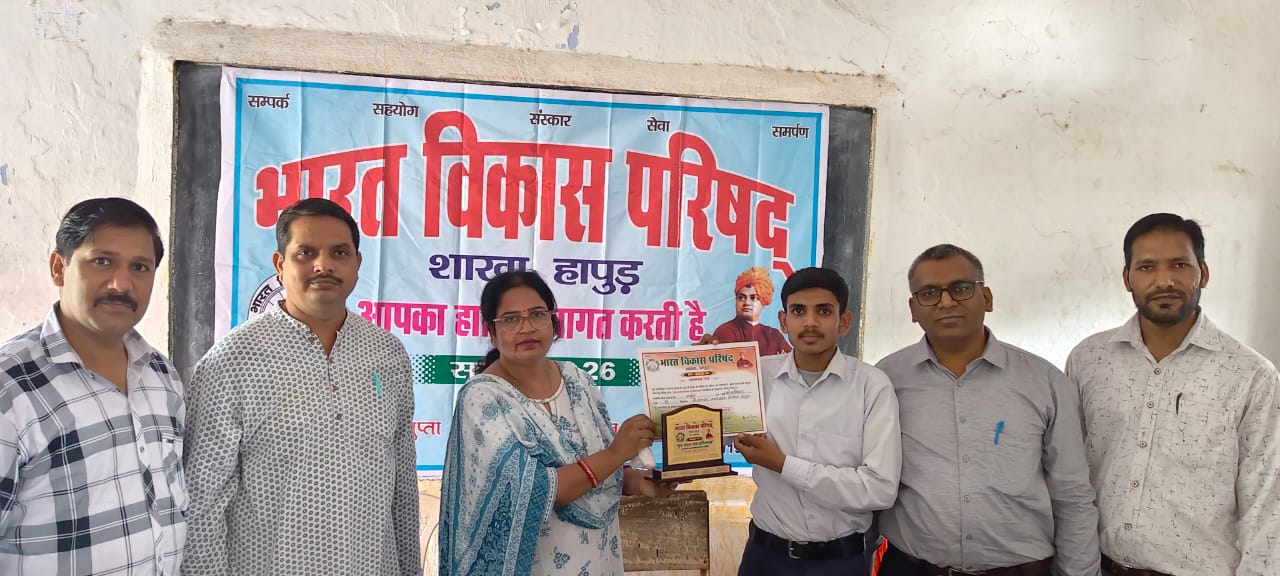 हापुड़, सीमन (ehapurnews.com): भारत विकास परिषद हापुड़ शाखा द्वारा बालक एवं बालिकाओं के ज्ञानवर्धन एवं चहुमुखी विकास हेतु बुधवार को चौधरी ताराचंद इंटर कॉलेज सराय हापुड़ में भारत को जानो प्रतियोगिता कराई गई जिसमें कुल 25 विद्यार्थियों ने हिस्सा लिया। साथ में स्कूलों में गुरु वंदन छात्र अभिनंदन कार्यक्रम का भी आयोजन किया गया जिसमें स्कूल के दो बेस्ट टीचर और दो बेस्ट स्टूडेंट को ट्रॉफी और पटका पहनाकर उनका सम्मान किया गया। स्कूल की प्रधानाचार्य को भी पटका पहनाकर सम्मान दिया गया। स्कूल की प्रधानाचार्य रश्मि चौधरी ने बच्चों के उज्जवल भविष्य के लिए उनका उत्साह वर्धन किया और गुरू वंदन का महत्व बताया। इस प्रतियोगिता और कार्यक्रम को सफल बनाने के लिए वरुण मित्तल सचिव और राजेश शर्मा का विशेष योगदान रहा।
