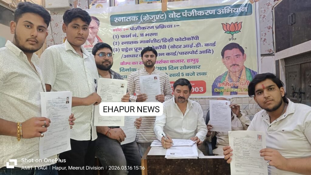 हापुड़, सीमन (ehapurnews.com): आगामी विधान परिषद स्नातक चुनाव 2026 के लिए रविवार एवं सोमवार को हापुड़ नगर के स्वर्ग आश्रम के त्यागी नगर मोहल्ला एवं सर्राफा बाजार में डॉ. अशोक नागर (पूर्व MLC प्रत्याशी स्नातक भाजपा) के समर्थन में विधान परिषद स्नातक चुनाव के लिए कैंप लगा कर वोट बनवाने हेतु फॉर्म भरवाने का कार्य किया गया।
