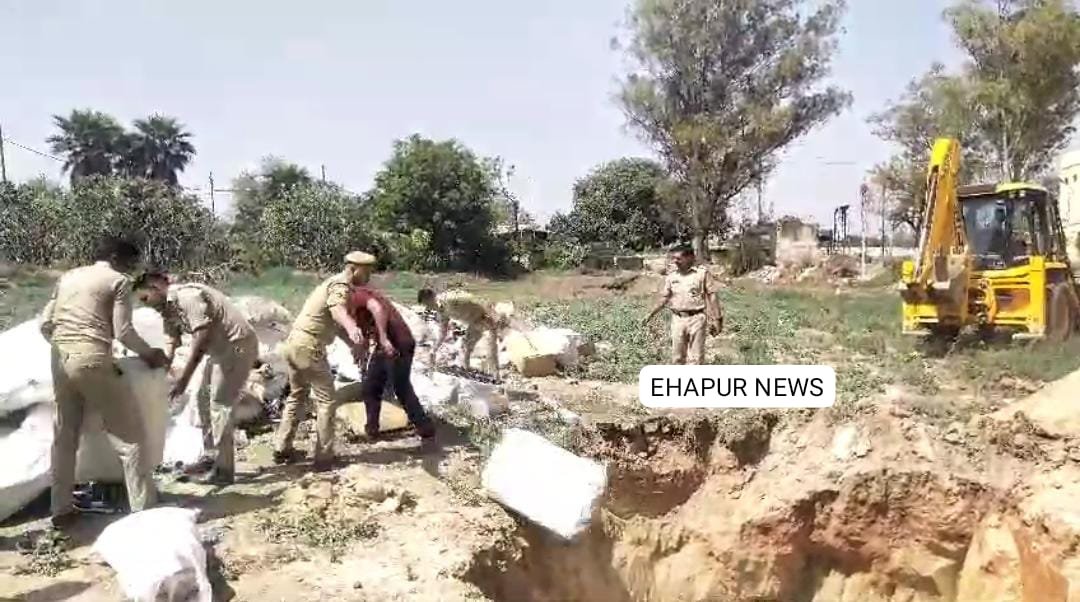 हापुड़, सीमन/अमित कुमार (ehapurnews.com): जनपद हापुड़ के थाना बाबूगढ़ पर माल निस्तारण अभियान के अंतर्गत माल मुकदमाती से सम्बन्धित 181 कट्टे गोल्ड स्टार मार्का (नकली) कुल 5430 जोडी जूते गोल्ड स्टार व 4460 अधबने जूते गोल्डस्टार मार्का (नकली) व 22 विभिन्न अभियोगों से बरामद लगभग अवैध देशी शराब को न्यायालय के आदेश के अनुपालन में बुधवार को पुलिस नष्ट किया। बाबूगढ़ थाने पर पंजीकृत कुल 23 अभियोगों से संबंधित माल को नष्ट किया गया। 22 अभियोगों से जुड़ी करीब 110 लीटर अवैध शराब और कॉपीराइट ट्रेडमार्क एक्ट से संबंधित भारी मात्रा में गोल्ड स्टार के नकली जूते को जेसीबी मशीन की मदद से गड्डा खुदवा कर नष्ट किया गया।