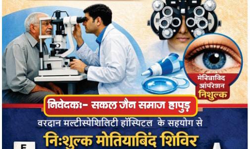 हापुड, सीमन/सुरेश जैन (Ehapurnews.com): जैन समाज के अध्यक्ष अनिल जैन ने बताया कि 18 जनवरी रविवार को प्रातःकाल 10 बजे से दोपहर 1 बजे तक सन्त भवन, जैन लोक, कोठी गेट पर निशुल्क नेत्र जांच शिविर आयोजित होगा जिसमे निशुल्क नेत्र जांच कर दवा दी जायेगी, आखॅ मे मोतियाबिन्द पाए जाने पर उन्हे वरदान नेत्र चिकित्सालय गाजियाबाद ले जाकर निशुल्क आप्रेशन कर लैस लगाये जाएगे, गाजियाबाद ले जाना, वापिस हापुड लाना, आप्रेशन, लैस, दवा, भोजन, आवास सभी निशुल्क होगे।