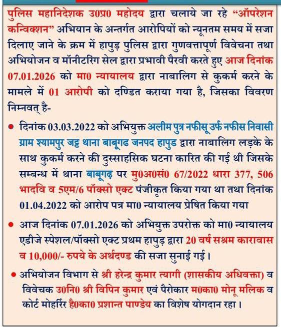 हापुड, सीमन (ehapurnews.com):ऑपरेशन कन्विक्शन अभियान के अन्तर्गत आरोपियों को न्यूनतम समय में सजा दिलाए जाने के क्रम में हापुड़ पुलिस द्वारा न्यायालय में प्रभावी, सशक्त पैरवी करते हुए नाबालिग से कुकर्म करने के मामले में एक अभियुक्त को 20 वर्ष का सश्रम कारावास व 10,000/- रुपये के अर्थदण्ड से दंडित कराया गया।अभियुक्त थाना बाबूगढ के गांव श्यामपुर जट का अलीम है।अभियुक्त अब जेल में चक्की पीसेगा