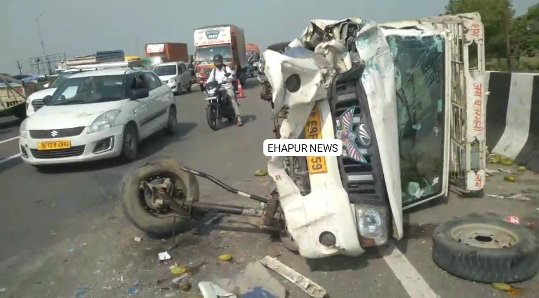 हापुड़, सीमन/अशोक तोमर (ehapurnews.com): जनपद हापुड़ के थाना देहात के सामने स्थित राष्ट्रीय राजमार्ग-9 पर बुधवार की देर रात आम से भरी एक महिंद्रा पिकअप ब्रेक फेल होने के कारण बस से टकराकर अनियंत्रित होकर पलट गई। सड़क हादसे के दौरान वाहन में सवार लोग बाल-बाल बच गए। इस दौरान महिंद्रा पिकअप गाड़ी क्षतिग्रस्त हो गई। सूचना पर पुलिस मौके पर पहुंची जिसने क्षतिग्रस्त वाहन को साइड कराया और वाहन में सवार लोगों का हाल जाना।