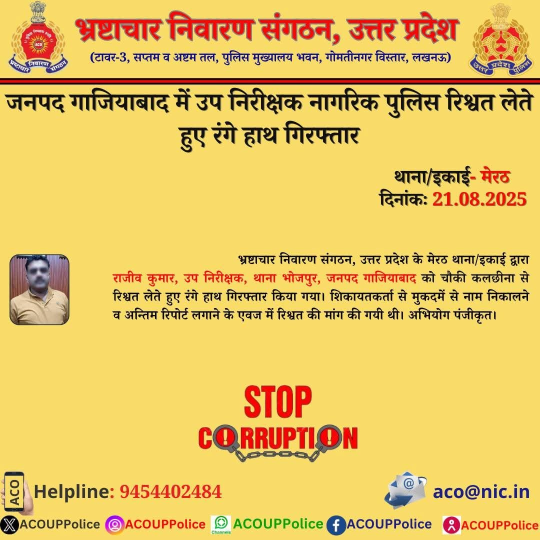 गुरुवार को मोदीनगर रोड पर स्थित थाना भोजपुर जनपद गाजियाबाद में उस समय हड़कंप मच गया जब एंटी करप्शन की टीम ने चौकी कलछीना से रिश्वत लेते दरोगा को रंगे हाथों गिरफ्तार कर उसे जेल भेज दिया।