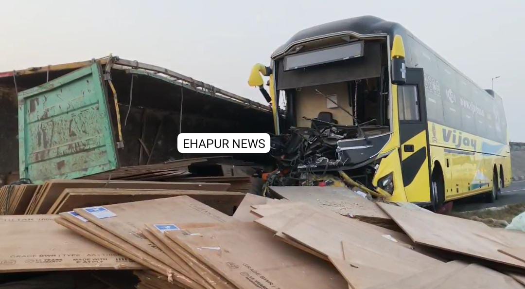 हापुड़, सीमन/अमित कुमार (ehapurnews.com): जनपद हापुड़ के थाना हाफिजपुर क्षेत्र में शनिवार को सोना पेट्रोल पंप के पास फ्लाईओवर पर एक निजी बस और ट्रक की भिड़ंत हो गई। सड़क हादसे के दौरान चीख पुकार मच गई। यात्रियों से भरी बस में सवार लोगों में हड़कंप मच गया। हादसे में पांच लोग घायल हो गए जिन्हें अस्पताल में भर्ती कराया गया। बताया जा रहा है कि दो को रेफर कर दिया गया है। पुलिस मामले की जांच कर रही है।