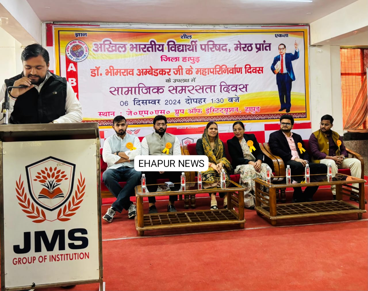 हापुड़, सीमन (ehapurnews.com): अखिल भारतीय विद्यार्थी परिषद हापुड़ जिले के कार्यकर्ताओं के द्वारा बाबा साहेब डॉ भीमराव अंबेडकर के महापरिनिर्वाण दिवस (#सामाजिकसमरसतादिवस) के उपलक्ष्य मे जे एम एस ग्रुप ऑफ इंस्टीट्यूशन हापुड़ मे संगोष्ठी का विधिवत शुभारंभ मुख्य अतिथि जिला पंचायत अध्यक्ष हापुड़ रेखा नागर, विशिष्ठ अतिथि जिला विद्यालय निरीक्षक डॉ विनीता, मुख्य वक्ता लक्षित सिंघल, कार्यक्रम अध्यक्ष आयुष सिंघल व मुख्य रूप से प्रदेश सहमंत्री व जिला विस्तारक अर्जुन बटार के द्वारा दीप प्रज्वलित कर किया गया। इस अवसर पर मुख्य अतिथि रेखा नगर के द्वारा डॉ भीम राव आंबेडकर के द्वारा सामाजिक समरसता के लिए समाज में किए गए कार्यों का उल्लेख किया गया। डॉ विनीता ने बताया कि छात्र ही देश का भविष्य है उनके लिए सामाजिक समरसता का भाव बहुत ही महत्वपूर्ण है । विद्यार्थियों के द्वारा जात पात से अलग रहकर केवल शिक्षित होने व राष्ट्र व समाज के लिए अपनी भूमिका तय करने का काम किया जाना चाहिए । मुख्य वक्ता लक्षित सिंघल ने अभाविप के द्वारा सामाजिक समरसता के लिए किए जा रहे कार्यों पर प्रकाश डाला। इस कार्यक्रम का सुंदर संचालन नितिन पुनिया ने किया । मुख्य रूप से धर्मेंद सिंह, दीक्षांक अग्रवाल,तुषार त्यागी, आदित्य अग्रवाल, मानव जायसवाल आदि उपस्थित रहे।