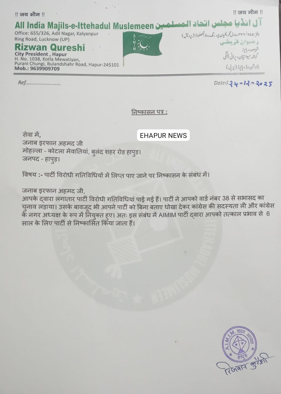 हापुड़, सीमन (ehapurnews.com): AIMIM पार्टी ने इरफान अहमद को पार्टी विरोधी गतिविधियों में लिप्त पाए जाने के कारण उन्हें पार्टी से छह साल के लिए निष्कासित किया है। शहर अध्यक्ष रिजवान कुरैशी ने निष्कासित किया है।