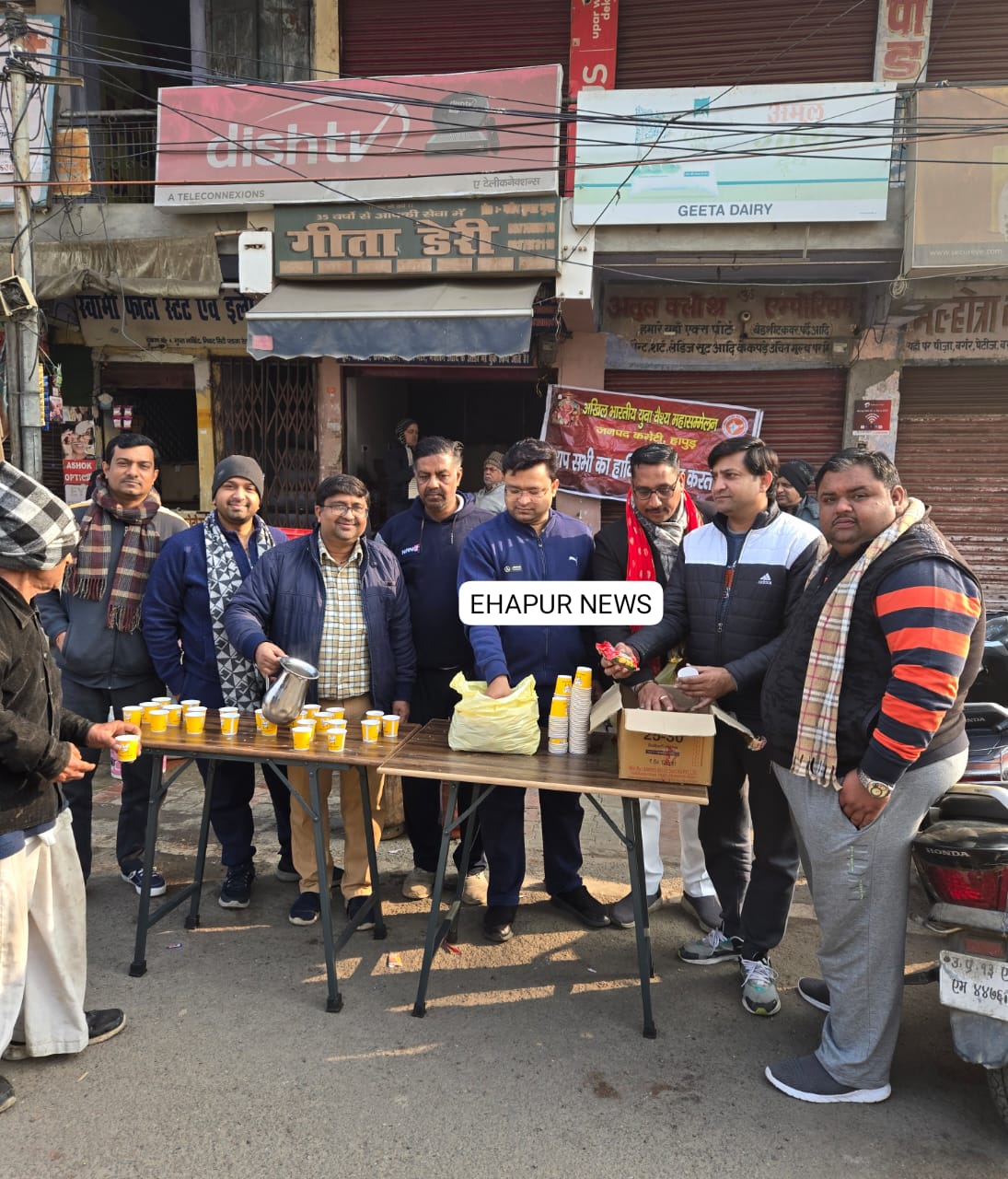 हापुड़, सीमन (ehapurnews.com): अखिल भारतीय युवा वैश्य महासम्मेलन जिला हापुड़ कमेटी द्वारा सर्दी के मौसम में लोगों को निशुल्क चाय वितरण किया गया। रेलवे रोड पर संगठन के पदाधिकारी इक्कठा हुए तथा सर्द सुबह से ही गरीबों को चाय वितरण करना शुरू किया। इस मौके पर सचिन सराफ, प्रिंस गोयल, व्यापारी नेता संजय अग्रवाल, विनय गोयल, मोहित, मुदित, शुभम सिंघल, राहुल बंसल, सजल, करुण कंसल, प्रशांत, नीरज गर्ग, आशीष संस्कार वाले आदि उपस्थित रहे।
