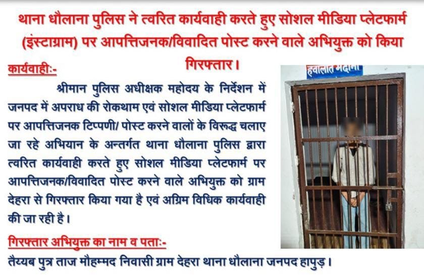 थाना धौलाना पुलिस ने त्वरित कार्यवाही करते हुए सोशल मीडिया प्लेटफार्म (इंस्टाग्राम) पर आपत्तिजनक व विवादित पोस्ट करने वाले अभियुक्त को गिरफ्तार कर लिया। आरोपी गांव देहरा का तैय्यब है।पुलिस ने आरोपी को जेल भेज दिया है।
