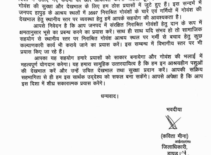 गोवंश संरक्षण के लिए डीएम की नागरिको से मार्मिक अपील Featured Hapur News | हापुड़ न्यूज़ गोवंश संरक्षण के लिए डीएम की नागरिको से मार्मिक अपील Pankaj Kashyap April 22, 2026 हापुड़, सीमन (ehapurnews.com): जनपद हापुड़ की जिलाधिकारी कविता मीणा ने जनपदवासियों से अपील की है कि गवंशों...Read More