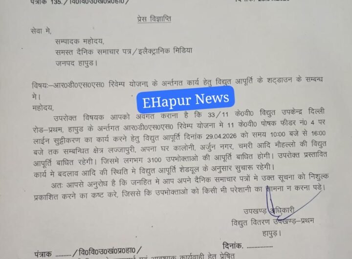 हापुड़ के 31 सौ उपभोक्ता 29 अप्रैल को 6 घंटे बिजली के लिए तरसेंगे Featured Hapur City News || हापुड़ शहर न्यूज़ हापुड़ के 31 सौ उपभोक्ता 29 अप्रैल को 6 घंटे बिजली के लिए तरसेंगे Pankaj Kashyap April 29, 2026 हापुड़, सीमन/संजय कश्यप (ehapurnewscom): हापुड़ के मोहल्ला लज्जापुरी, अपना घर कॉलोनी, अर्जुन नगर, चमरी आदि इलाके के...Read More