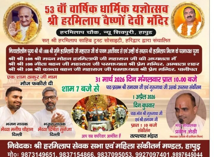 श्री हरमिलाप मंदिर का वार्षिकोत्सव 31 मार्च से Featured Hapur City News || हापुड़ शहर न्यूज़ श्री हरमिलाप मंदिर का वार्षिकोत्सव 31 मार्च से Satya Prakash Seeman March 18, 2026 श्री हरमिलाप मंदिर का वार्षिकोत्सव 31 मार्च सेहापुड, सीमन (ehapurnews.com):हापुड के नई शिवपुरी में स्थित श्री हरमिलाप...Read More