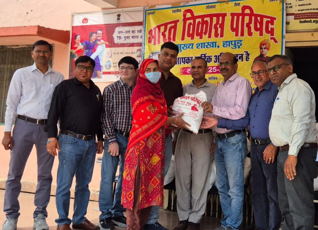 हापुड़,सूवि(ehapurnews.com): भारत सरकार की महत्वाकांक्षी परियोजना टी 0बी0 मुक्त भारत अभियान में जिला अधिकारी अभिषेक पांडेय के निर्देशन में एवं मुख्य चिकित्सा अधिकारी डॉ सुनील कुमार त्यागी के नेतृत्व में जनपद में विभिन्न सामाजिक संगठनों एवम् संस्थाओं द्वारा प्रधानमंत्री टी 0बी0 मुक्त भारत अभियान में समय समय पर सहयोग करते रहे हैं। इसी क्रम में आज जनपद हापुड़ कि संस्था भारत विकास परिषद मुख्य शाखा हापुड़ द्वारा जिला क्षय रोग केंद्र हापुड़ पर 75 क्षय रोगियों को पोषण पोटली वितरण किया