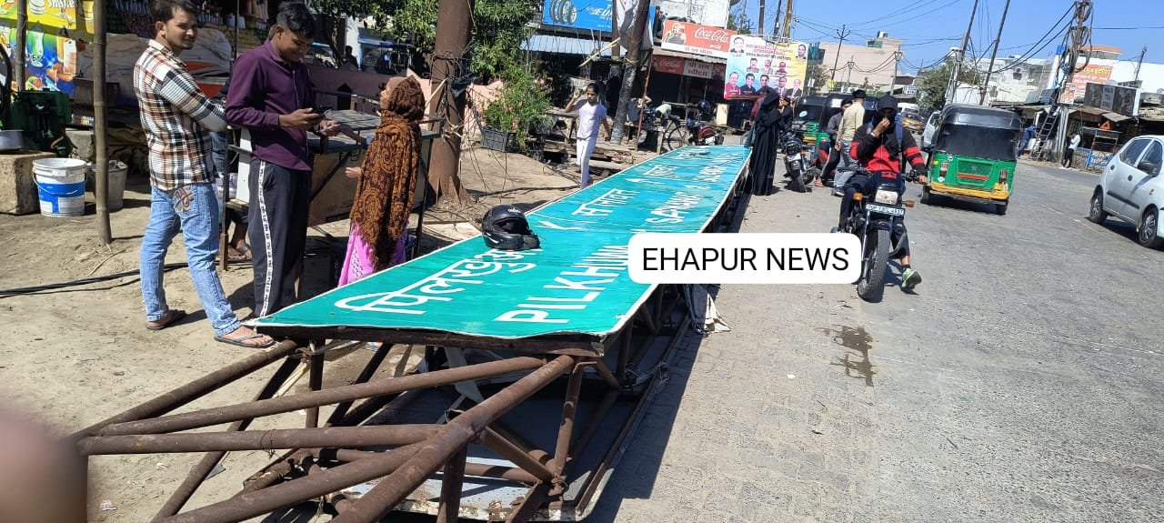 हापुड़, सीमन (ehapurnews.com): जनपद हापुड़ के धौलाना में चौराहे पर लोक निर्माण विभाग द्वारा लगाया गया संकेतक बोर्ड बुधवार को तेज हवाओं के कारण अचानक के नीचे आ गिरा। इस दौरान एक बाइक सवार संकेतक बोर्ड की चपेट में आकर घायल हो गया जिसे अस्पताल में भर्ती कराया गया। लोगों ने मामले में नाराजगी जाहिर की है।