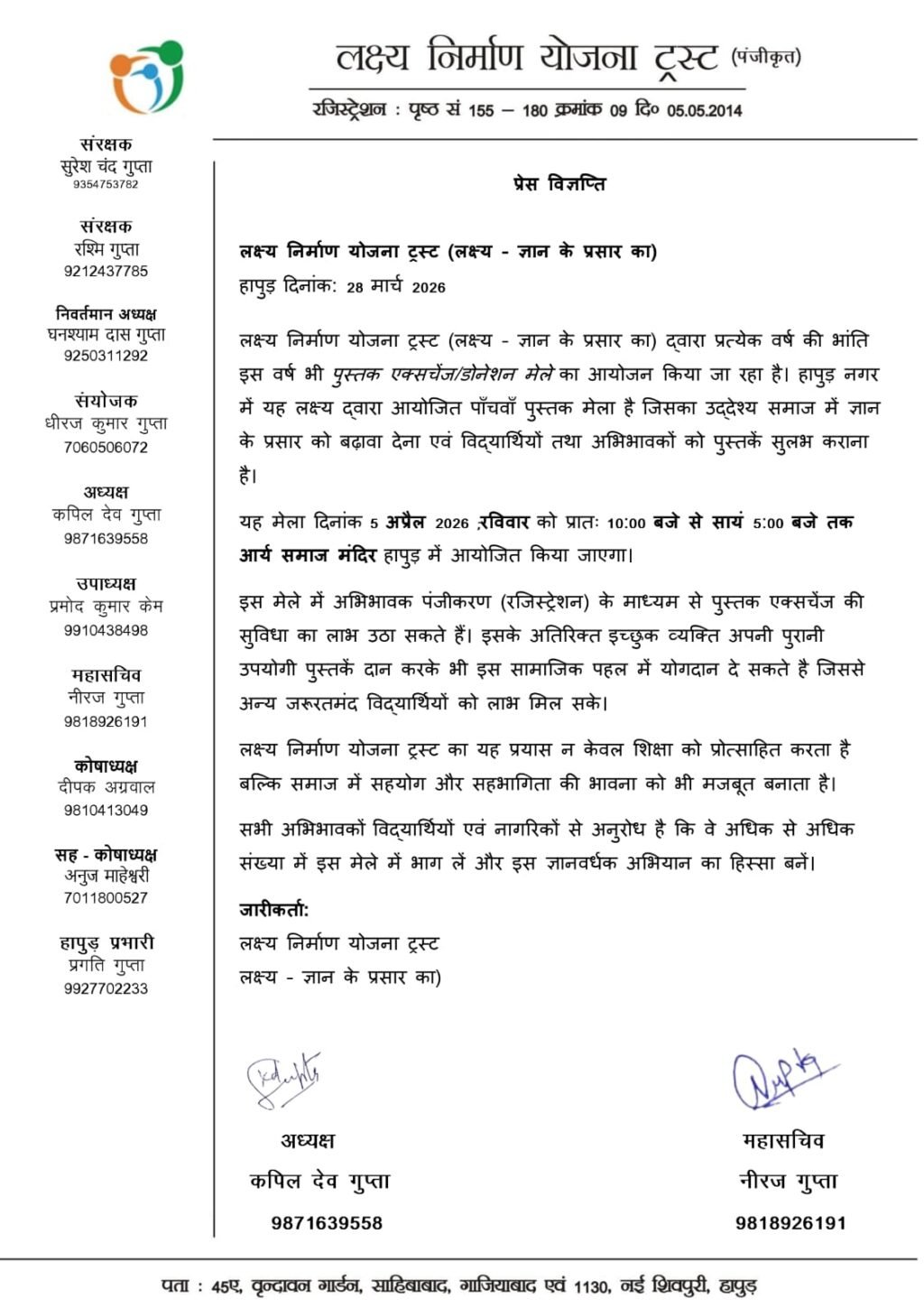 हापुड़, सीमन (ehapurnews.com): लक्ष्य निर्माण योजना ट्रस्ट (लक्ष्य ज्ञान के प्रसार का) द्वारा प्रत्येक वर्ष की भांति इस वर्ष भी पुस्तक एक्सचेंज व डोनेशन मेले का आयोजन किया जा रहा है। हापुड़ नगर में यह लक्ष्य द्वारा आयोजित पाँचवाँ पुस्तक मेला है जिसका उद्देश्य समाज में ज्ञान के प्रसार को बढ़ावा देना एवं विद्यार्थियों तथा अभिभावकों को पुस्तकें सुलभ कराना है।