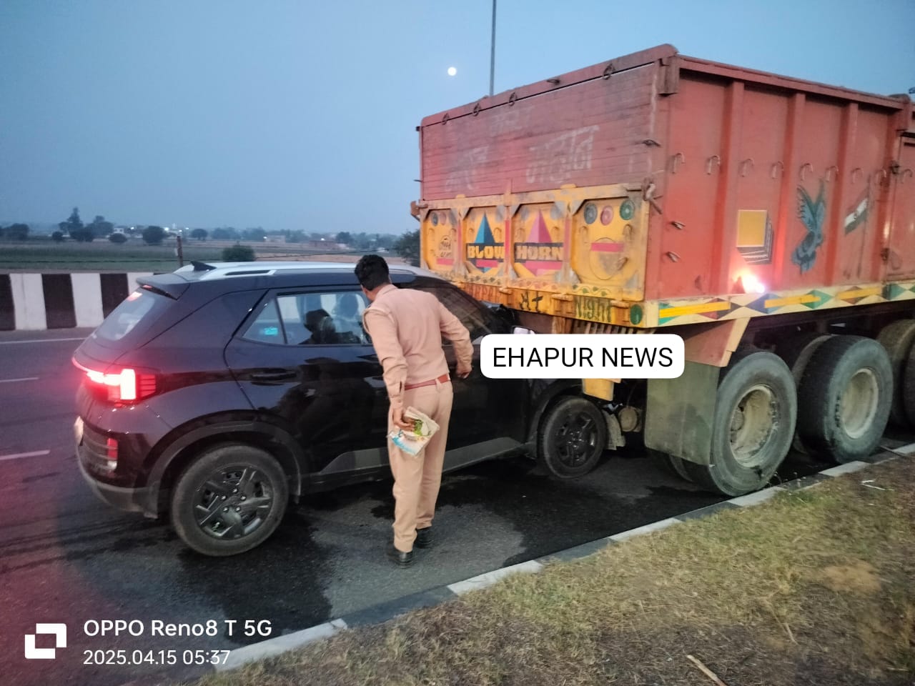 हापुड़, सीमन/अमित कुमार (ehapurnews.com): जनपद हापुड़ के थाना बाबूगढ़ कोतवाली क्षेत्र के बागड़पुर फ्लाईओवर के ऊपर एक गाड़ी और ट्रक की भिड़ंत हो गई। आगे चल रहे ट्रक में पीछे से आई गाड़ी ने टक्कर मार दी जिससे गाड़ी में सवार चार लोग घायल हो गए। सूचना पर बाबूगढ़ कोतवाली पुलिस मौके पर पहुंची और घायलों का हाल जाना। पुलिस ने क्षतिग्रस्त वाहनों को हाईवे से हटवा दिया है।