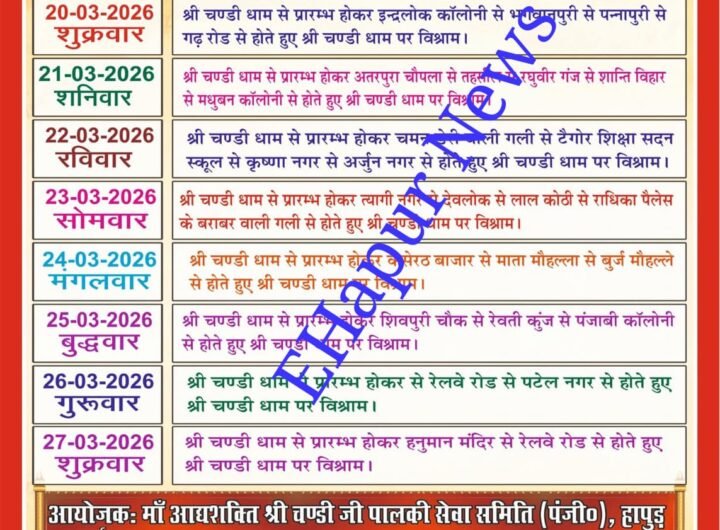 मां चंडी जी की पालकी प्रभात फेरी 19 मार्च को Featured Hapur City News || हापुड़ शहर न्यूज़ मां चंडी जी की पालकी प्रभात फेरी 19 मार्च को Satya Prakash Seeman March 6, 2026 मां चंडी जी की पालकी प्रभात फेरी 19 मार्च को हापुड़, सीमन (ehapurnews.com): मां आध्यशक्ति श्री चंडी...Read More