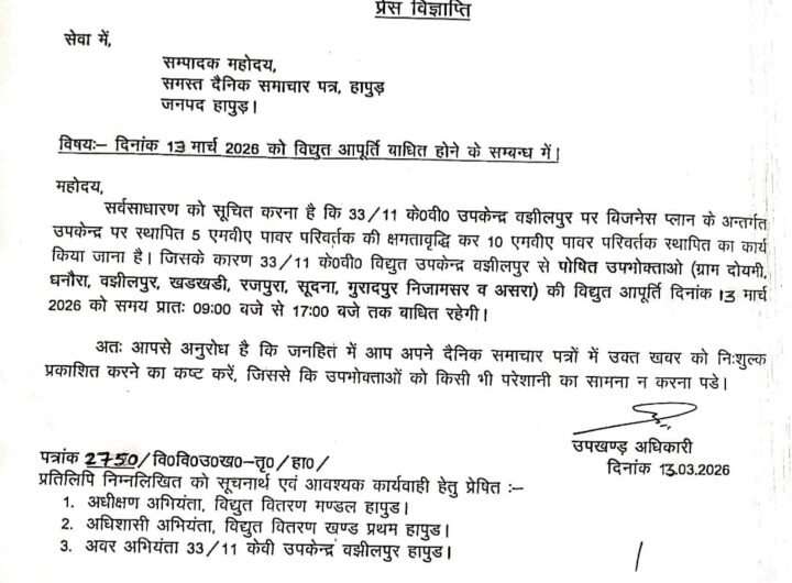 आज शाम 5:00 बजे तक प्रभावित रहेगी खड़खड़ी, वझीलपुर, धनोरा, असरा की विद्युत आपूर्ति Featured Hapur City News || हापुड़ शहर न्यूज़ आज शाम 5:00 बजे तक प्रभावित रहेगी खड़खड़ी, वझीलपुर, धनोरा, असरा की विद्युत आपूर्ति Satya Prakash Seeman March 13, 2026 आज शाम 5:00 बजे तक प्रभावित रहेगी खड़खड़ी, वझीलपुर, धनोरा, असरा की विद्युत आपूर्ति हापुड़, सीमन (ehapurnews.com):...Read More