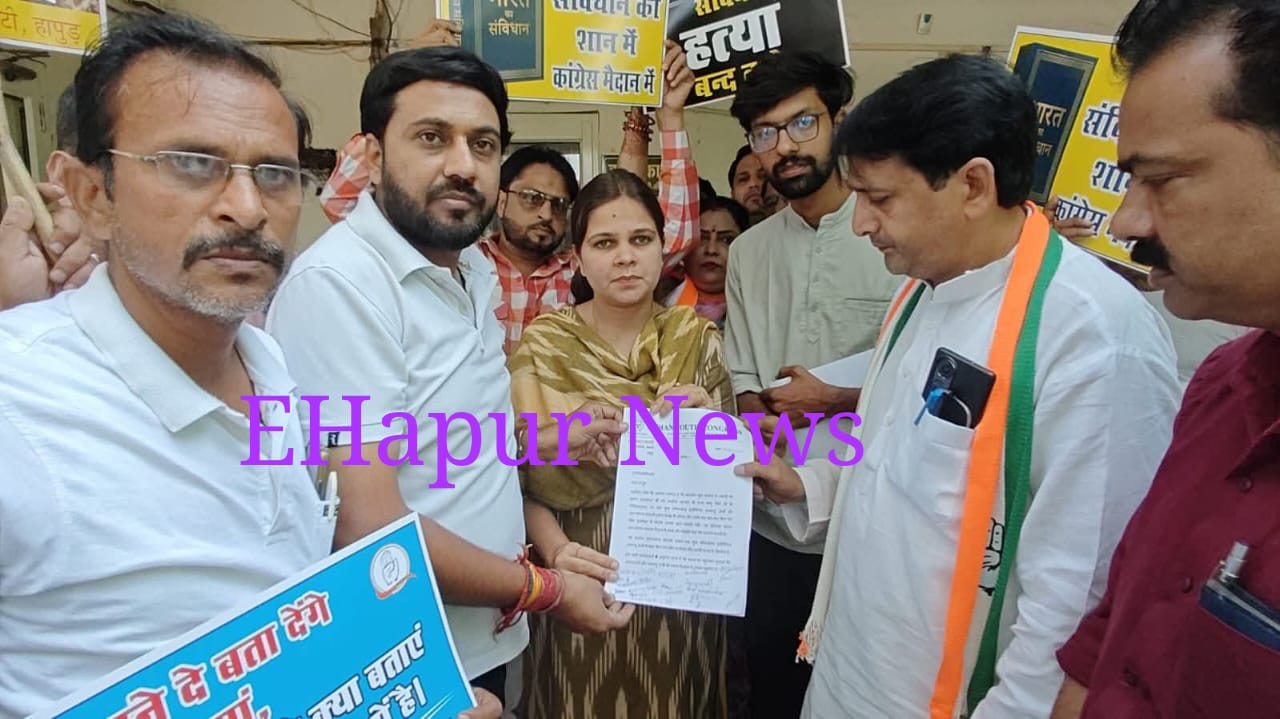 हापुड, सीमन (ehapurnews.com): हापुड़ में‌ यूथ कांग्रेस के नेता अनमोल शर्मा और विधान सभा अध्यक्ष आकाश त्यागी ने मंगलवार को एस डी एम हापुड को एक ज्ञापन देकर सॉफ्टवेयर इंजीनियर की मौत के लिए जिम्मेदार लोगो को गिरफ्तार करने व फांसी की सजा दिए जाने की मांग की।