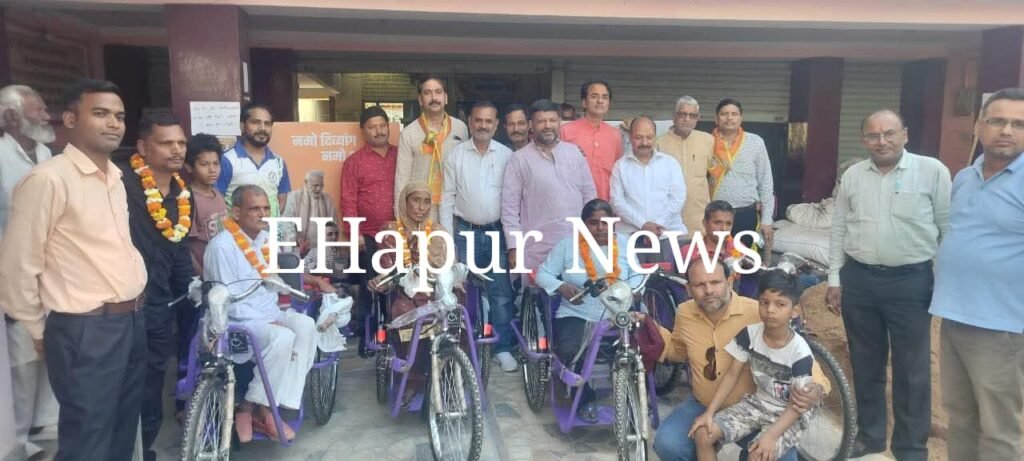हापुड, सीमन (ehapurnews.com):नमों दिव्यांग अभियान’ भारत के अंतर्गत डिसएबल्ड हेल्पलाइन फ़ाउंडेशन के तत्वावधान में आर्य समाज मंदिर प्रांगण में आयोजित एक कार्यक्रम में पाँच दिव्यांग जनों को मोटराइज ट्राईसाइकल, बैसाखी उपलब्ध करायी गयी।