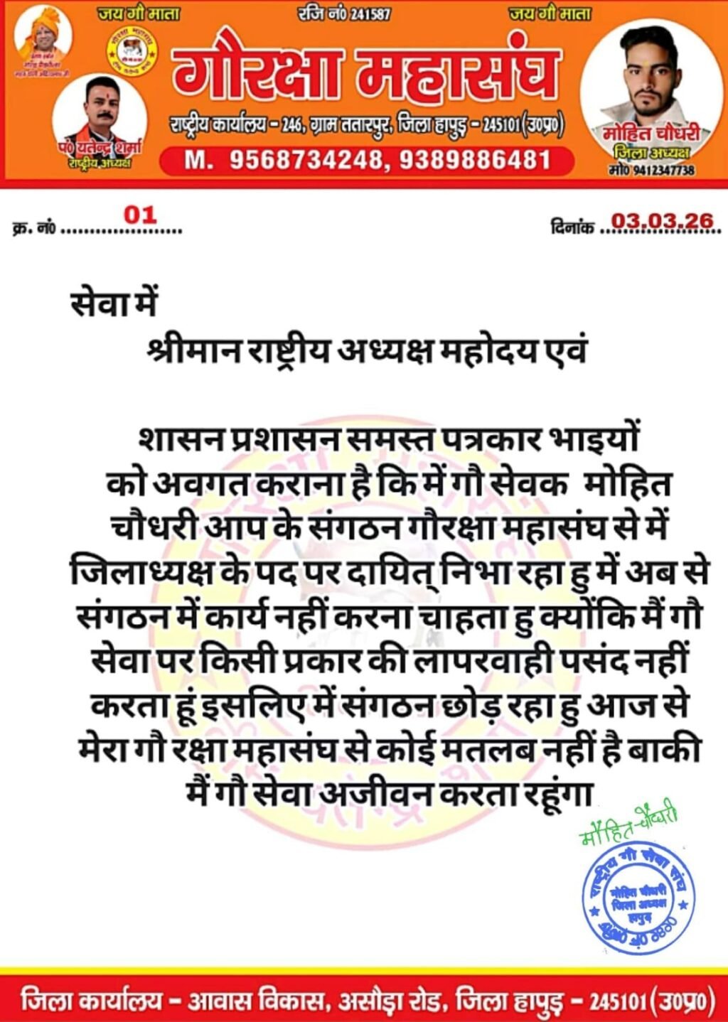 गौरक्षा महासंघ के जिलाध्यक्ष ने छोड़ा संगठन