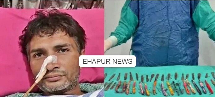 हापुड़, सीमन (ehapurnews.com): हापुड़ में चिकित्सकों के एक दल ने एक 40 वर्षीय नशेड़ी के पेट से आपरेशन करके 29 स्टील की चम्मच, 19 टूथ ब्रश, दो नुकिले पेन निकले है। नशेड़ी के पेट में यह सब देखकर चिकित्सकों का दल भी भौचक्का रह गया। यह मामला हापुड़ में स्थित देवनंदिनी हास्पिटल का है।