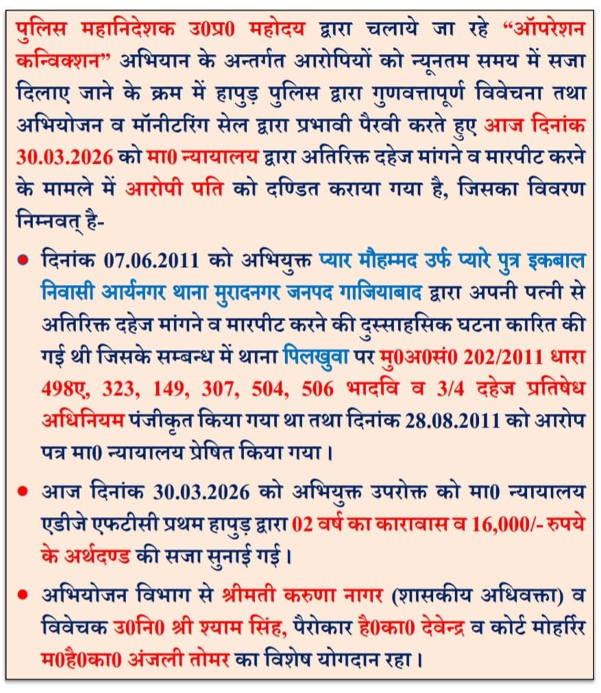 हापुड, सीमन (ehapurnews.com):ऑपरेशन कन्विक्शन अभियान के अन्तर्गत आरोपियों को न्यूनतम समय में सजा दिलाए जाने के क्रम में हापुड़ पुलिस द्वारा न्यायालय में प्रभावी, सशक्त पैरवी करते हुए अतिरिक्त दहेज मांगने व मारपीट करने के मामले में आरोपी पति को 02 वर्ष का कारावास व 16,000/-रुपये के अर्थदण्ड से दंडित कराया गया।अभियुक्त जनपद गाजियाबाद के थाना मुरादनगर के आर्य नगर का प्यार मौहम्मद उर्फ प्यारे है।अभियुक्त को जेल भेज दिया है।