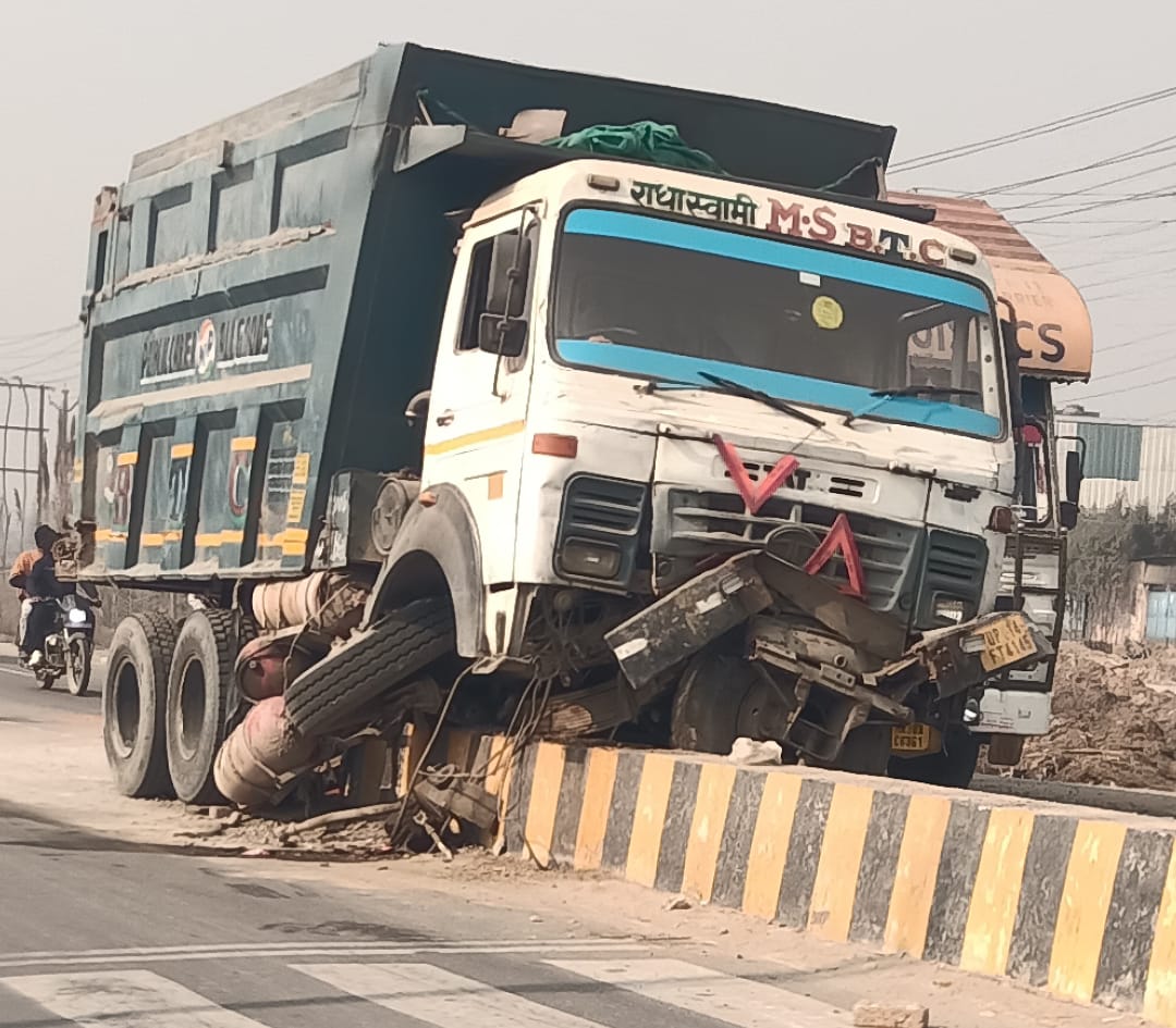 कोहरे के कारण डिवाइडर पर चढ़ा डंपर