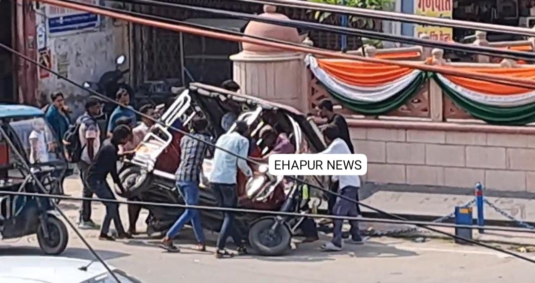 हापुड़, सीमन/ संजय कश्यप  (ehapurnews.com): हापुड़ की दिल्ली रोड पर स्थित अंबेडकर तिराहे के पास एक ई-रिक्शा अनियंत्रित होकर पलट गई। गनीमत रही किसी को ज्यादा चोट नहीं आई। शोर सुनकर आसपास मौजूद लोग व राहगीर तुरंत घटनास्थल की ओर दौड़े और सवारियों को निकाल ई-रिक्शा को सीधा कराया।