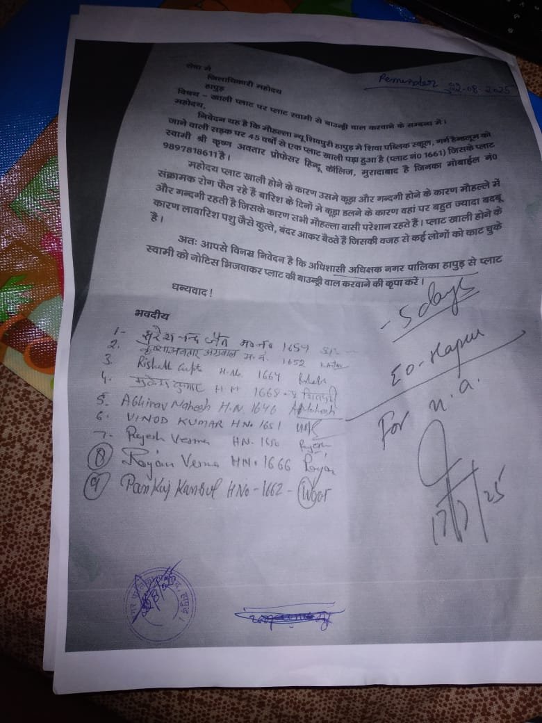 अधिशासी अधिकारी नगर पालिका हापुड से खाली पड़े प्लाट के स्वामी को नोटिस भिजवाकर बाउंड्रीवाल करवाने को ज्ञापन दिया