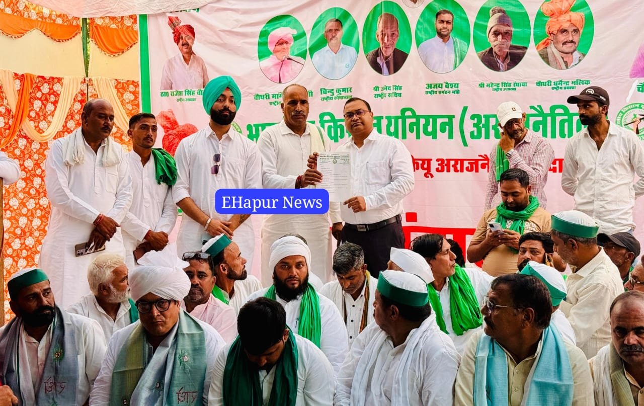 हापुड, सीमन (ehapurnews.com):भारतीय किसान यूनियन अराजनैतिक की महापंचायत सिंभावली गन्ना समिति में हुई जिसमें जिलाध्यक्ष पवन हूण गुर्जर के साथ दर्जनों गांव से किसान ट्रैक्टर ट्रॉली से गन्ना समिति पहुंचे जहां मुख्य अतिथि राष्ट्रीय प्रवक्ता चौ० धर्मेन्द्र मलिक व राष्ट्रीय उपाध्यक्ष चौ० मांगेराम त्यागी तथा पंचायत की अध्यक्षता तिलकराम त्यागी जी व संचालन जितेंद्र नागर ने किया पंचायत में नोएडा से महेंद्र मुखिया व मेरठ से कालू प्रधान पहुंचे जहां पंचायत में एडीएम संदीप कुमार ने पहुंचकर किसानों की समस्याओं को सुना और मुख्यमंत्री के नाम ज्ञापन लेकर लिखित समस्याओं का आश्वासन दिया