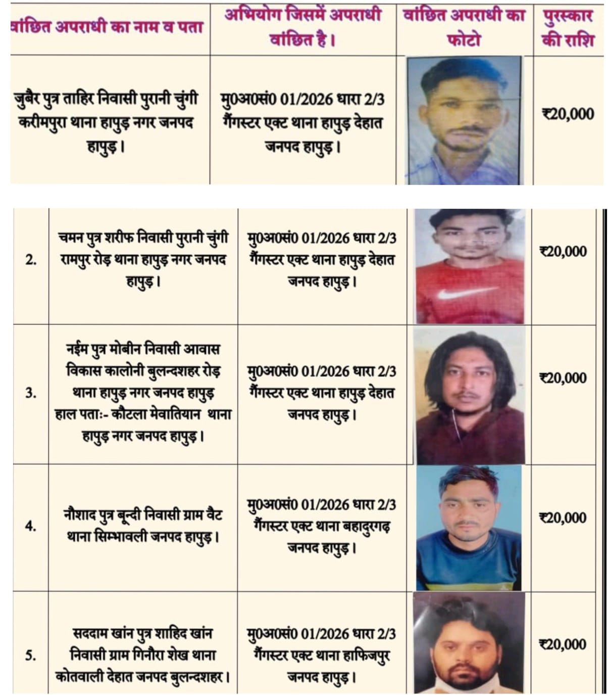 जनपद हापुड के 5 अपराधी इनामी घोषित
