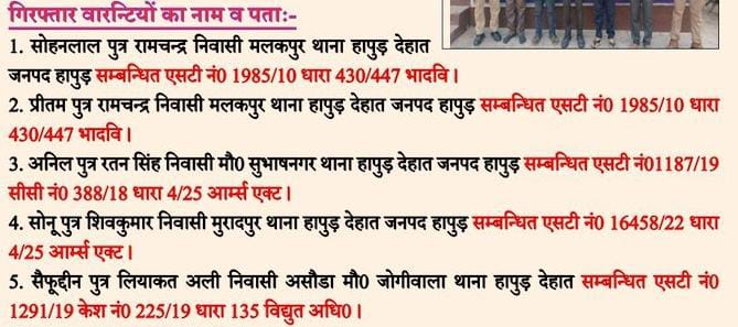 हापुड, सीमन (ehapurnews.com):हापुड़ पुलिस द्वारा जनपद में अपराध की रोकथाम एवं वारन्टी व वांछित अभियुक्तों की गिरफ्तारी हेतु चलाए जा रहे ऑपरेशन तलाश अभियान के अन्तर्गत थाना हापुड देहात पुलिस ने 5 वारन्टियों को गिरफ्तार कर लिया।वारंटी तारीख पर अदालत में हाजिर न हो रहे थे।