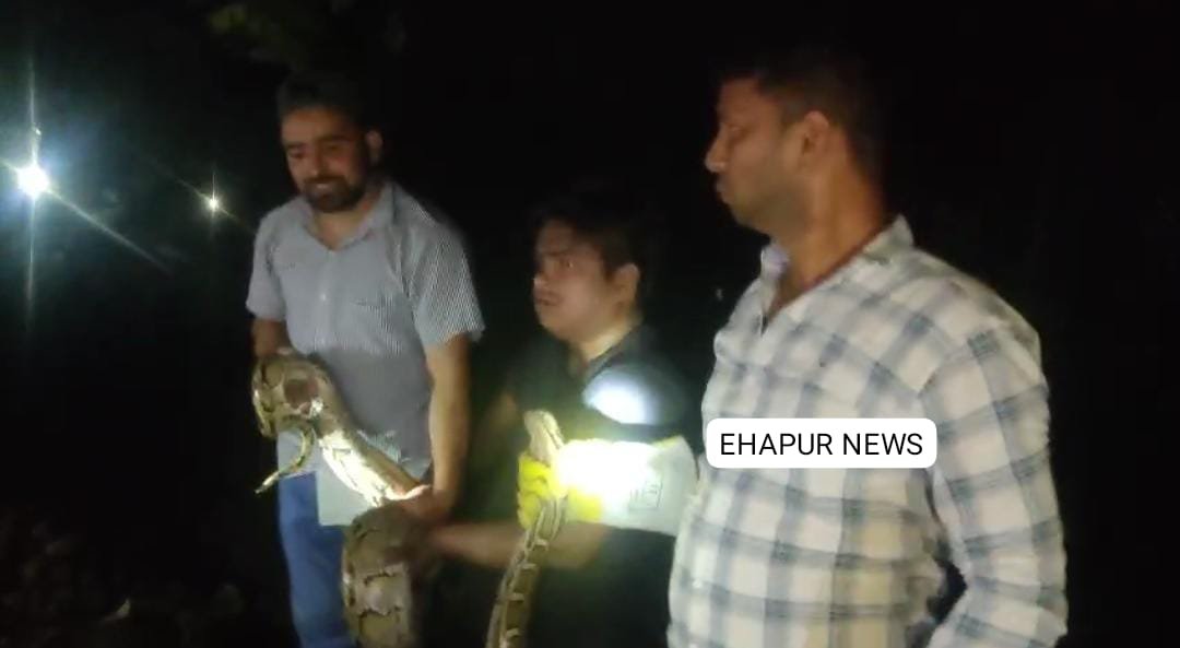 हापुड़, सीमन/संजय कश्यप (ehapurnews.com): हापुड़ की मेरठ रोड पर स्थित असौड़ा कट के पास शुक्रवार की रात एक 10 फीट लंबा अजगर देख लोगों के होश उड़ गए। उन्होंने तुरंत वन विभाग को मामले से अवगत कराया। सूचना पाकर वन विभाग की टीम मौके पर पहुंची। हापुड़ के फॉरेस्ट रेंजर मुकेश चंद्र कांडपाल के नेतृत्व में टीम ने रात के समय अभियान चलाया और कड़ी मशक्कत के बाद अजगर को पकड़ लिया। 10 फीट लंबे अजगर का सुरक्षित रेस्क्यू किया गया जिसके बाद उसे सुरक्षित स्थान पर छोड़ा गया। इसके बाद सभी ने राहत की सांस ली।