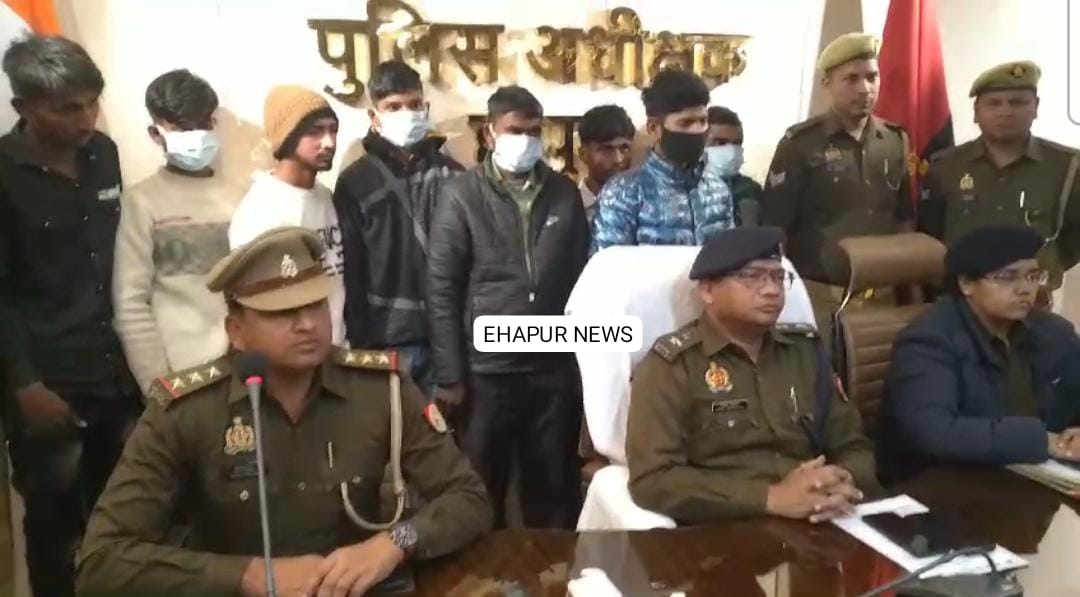 हापुड़ में आयोजित प्रेसवार्ता में पुलिस ने पत्रकारों को बताया कि आठ आरोपियों को गिरफ्तार कर लिया है जबकि राहुल निवासी नई सीलमनगर मौके से फरार है जिसकी पुलिस तलाश कर रही है। आरोपियों को पुलिस ने गुरुवार को स्याना रोड से बागड़पुर गांव को जाने वाले कट के पास से दबोचा है। गिरफ्तार किए गए कलवा के खिलाफ सात, सुरेंद्र के खिलाफ दो, सुभाष के खिलाफ दो, करण के खिलाफ दो, रोहित के खिलाफ दो, सुमित के खिलाफ दो, रविंद्र के खिलाफ दो और जीशान के खिलाफ भी दो मुकदमे दर्ज हैं।