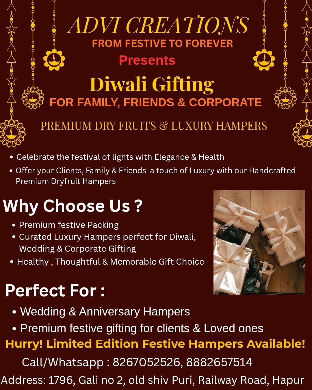 हापुड़, सीमन (ehapurnews.com): इस दिवाली, भाई दूज और वेडिंग सीजन में अपनों को कुछ खास देने के लिए ADVI CREATIONS आपके लिए लेकर आए हैं गिफ्ट हैम्पर जहां से आप अपने बजट में गिफ्ट हैंपर तैयार करा सकते हैं। चाहे त्यौहार हो या जन्मदिन की पार्टी. शादी हो या सगाई ADVI CREATIONS के यहां से आप अपनी पॉकेट के अनुसार गिफ्ट हैंपर तैयार करा सकते हैं। वह भी एक फोन पर। अधिक जानकारी के लिए संपर्क करें: आकांक्षा अग्रवाल 8267052526 या 8882657514