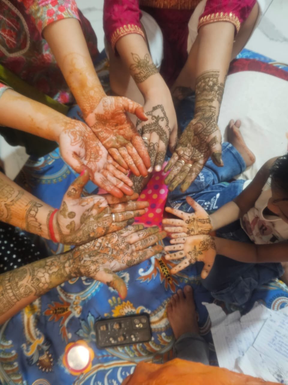 सेवा भारती केन्द्र की बालिकाओ ने पांच स्थानो पर कैम्प लगाकर मेहन्दी लगाई
