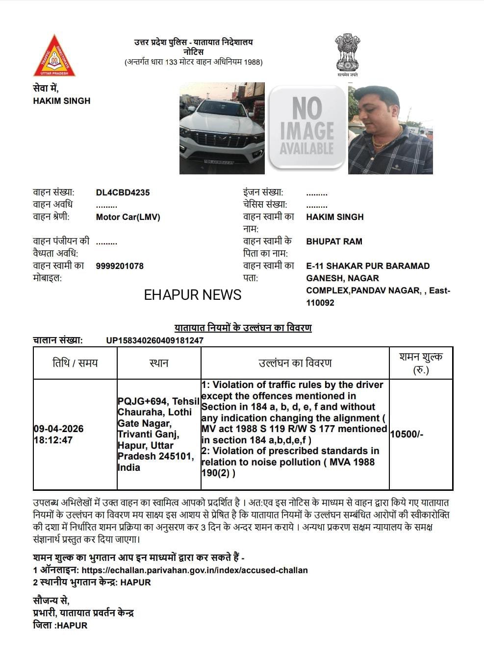 दरअसल मामला गुरुवार का बताया जा रहा है। जब एक सफेद रंग की स्कॉर्पियो गाड़ी तहसील चौराहा पर पहुंची जिस पर भाजपा का झंडा लगा था और कार सवार लगातार हूंटर बजा रहा था। यातायात पुलिस ने तुरंत गाड़ी को साइड कराया और भोकाल मचाने के मामले में गाड़ी का चालान कर दिया। यातायात प्रभारी नरेश कुमार ने बताया कि गाड़ी का 10,500 रुपए का चालान किया गया है।