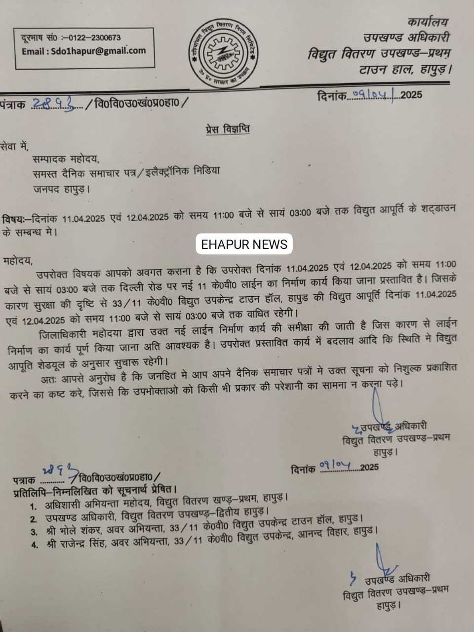 विद्युत वितरण उपखंड प्रथम हापुड़ खंड अधिकारी ने बताया कि 11 तथा 12 अप्रैल को सुबह 11:00 से दोपहर 3:00 तक विद्युत आपूर्ति शटडाउन रहेगी। दिल्ली रोड पर नई 11 केवी लाइन का निर्माण कार्य किया जाना प्रस्तावित है जिसके चलते सुरक्षा की दृष्टि से 33/11 केवी विद्युत केंद्र टाउन हॉल हापुड़ की विद्युत सप्लाई 11 व 12 अप्रैल को सुबह 11:00 बजे से दोपहर 3:00 बजे तक प्रभावित रहेगी।