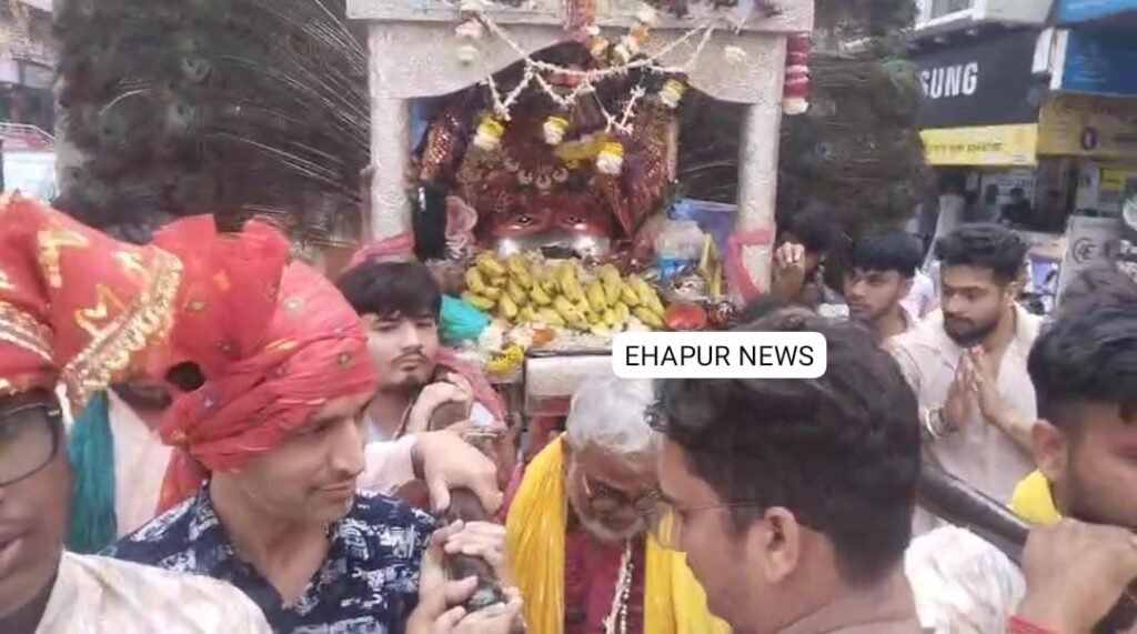 हापुड़, सीमन (ehapurnews.com): हापुड़ के विभिन्न क्षेत्रों में शुक्रवार को मां श्री चंडी महारानी की रसमयी शोभायात्रा विभिन्न मार्गों से निकाली गई। इस अवसर पर मां चंडी महारानी की पालकी का मोर पंखों द्वारा विशेष श्रृंगार किया गया। मैया के दर्शन करने के लिए सिर्फ हापुड़ ही नहीं बल्कि आसपास के क्षेत्र के लोग भी बड़ी संख्या में एकत्र हुए जिन्होंने मैया को भोग लगाया और उनका आशीर्वाद लिया। इस अवसर पर भक्त भजनों की धुन पर जमकर थिरके। मैया के जयकारों से पूरा परिसर गूंज उठा। जिस भी मार्ग से यात्रा गुजरी भक्तों ने यात्रा का पुष्प वर्षा के साथ भव्य स्वागत किया।