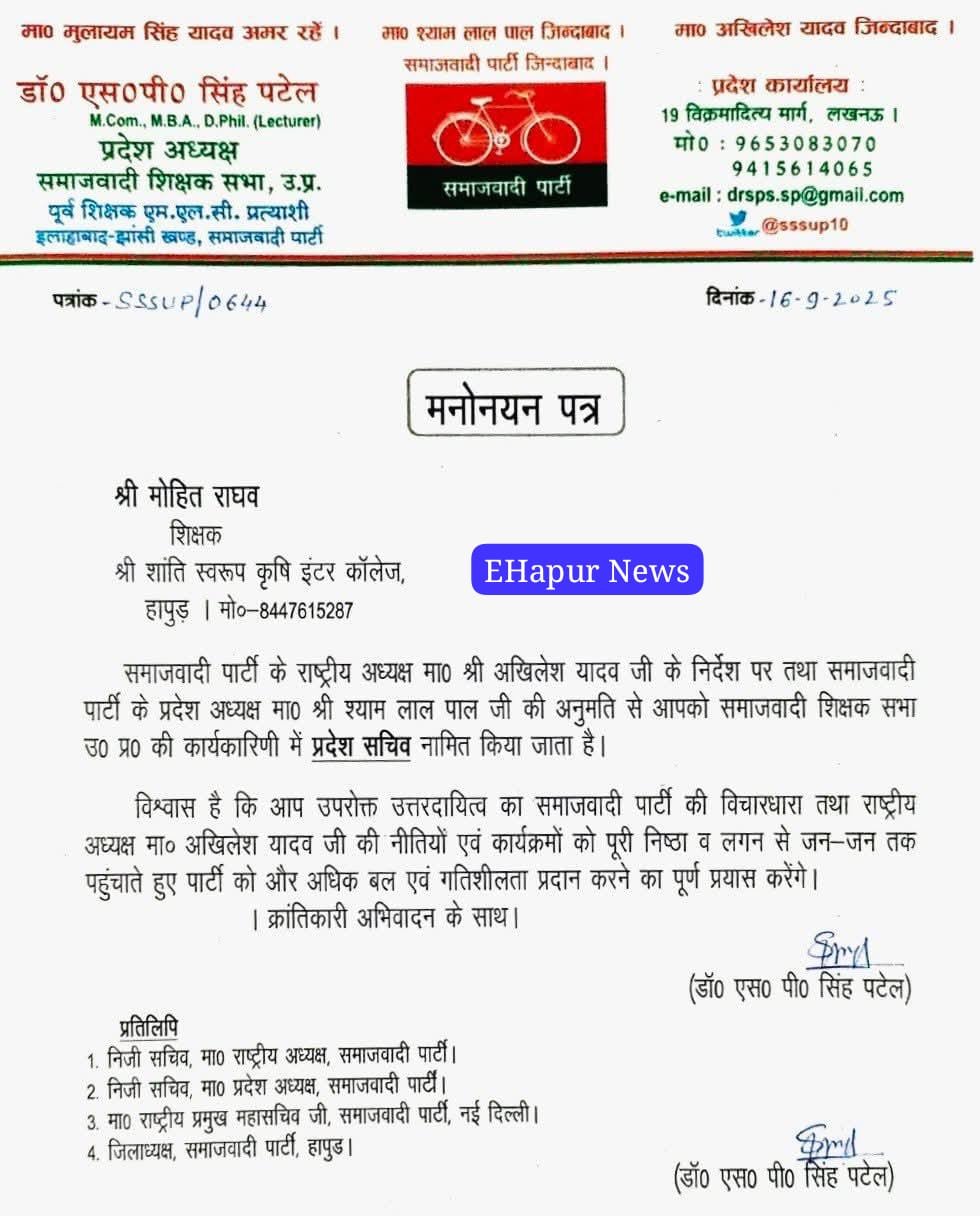 हापुड, सीमन (ehapurnews.com):हापुड के श्री शांति स्वरूप कृषि इंटर कालेज के शिक्षक मोहित राघव को समाजवादी शिक्षक सभा उत्तर प्रदेश की कार्य समिति हेतु प्रदेश सचिव नामित किया है।