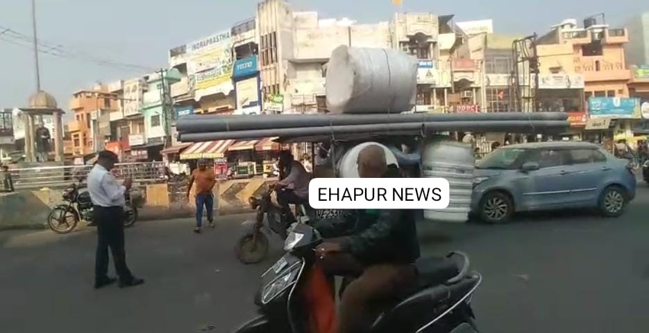 हापुड़, सीमन (ehapurnews.com): हापुड़ में नियमों के विपरीत ई-रिक्शाओं का संचालन हो रहा है। पैसेंजर ई-रिक्शाओं को नियमों के विपरीत अवैध रूप से व्यवसाय में इस्तेमाल किया जा रहा है। इसी के साथ ई-रिक्शाओं को ओवरलोड कर सड़क पर दौड़ाया जा रहा है। बुधवार को ऐसी ही एक ई-रिक्शा हापुड़ के अतरपुरा चोपला से गुजर रही थी जिसके बाद यातायात पुलिस कर्मियों ने मोर्चा संभाला और तुरंत ओवरलोड ई-रिक्शा का चालान कर दिया। यह ई-रिक्शा हादसे का कारण भी बन सकती है। ई-रिक्शा के ऊपर लदा पाइप लोगों की जान भी ले सकता है।