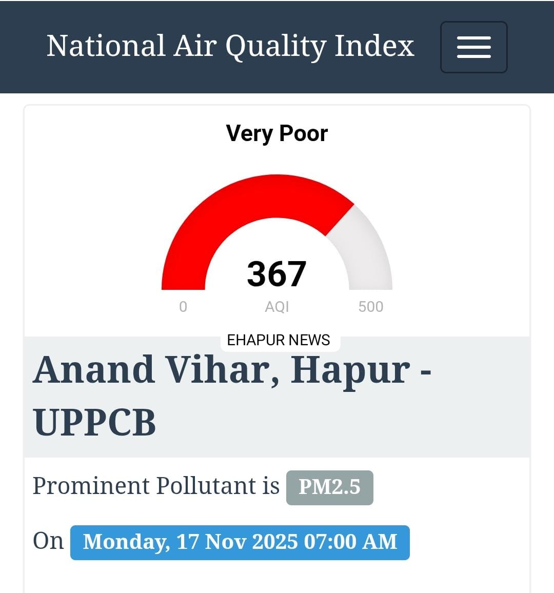 हापुड़, सीमन (ehapurnews.com): हापुड़ का एयर क्वालिटी इंडेक्स बेहद खतरनाक श्रेणी में है। हापुड़ का एक्यूआई सोमवार की सुबह 7:00 बजे 367 दर्ज किया गया जिससे लोगों के स्वास्थ्य पर विपरीत असर पड़ रहा है। हापुड़ की हवा की गुणवत्ता खतरनाक हो चुकी है। ऐसे में लोगों को आंखों में जलन, गले में खराश की शिकायत हो रही है। गर्भवती महिलाओं पर इसका ज्यादा प्रभाव पड़ रहा है।