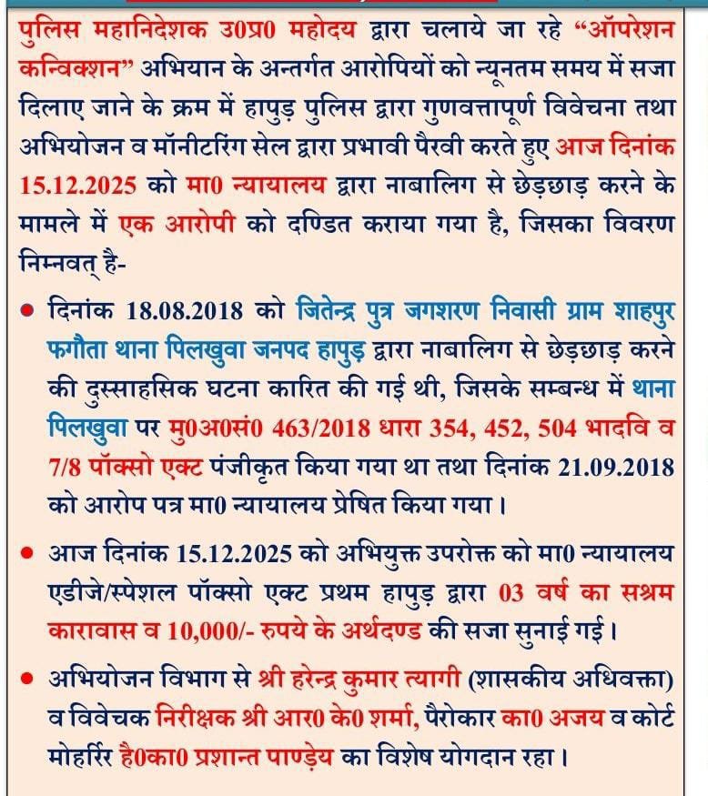 हापुड, सीमन (ehapurnews.com):उ0प्र0 सरकार द्वारा चलाए जा रहे “मिशन शक्ति फेज-5.0” अभियान में चिन्हित महिला सम्बन्धी अपराधों में आरोपियों को न्यूनतम समय में सजा दिलाये जाने के क्रम में हापुड़ पुलिस द्वारा न्यायालय में प्रभावी पैरवी करते हुए नाबालिग से छेड़छाड़ करने के मामले में एक आरोपी को 03 वर्ष का सश्रम कारावास व 10,000/- रुपये के अर्थदण्ड से दण्डित कराया गया।अभियुक्त गांव शाहपुर फगौता का जितेंद्र है।अभियुक्त को जेल भेज दिया गया है।